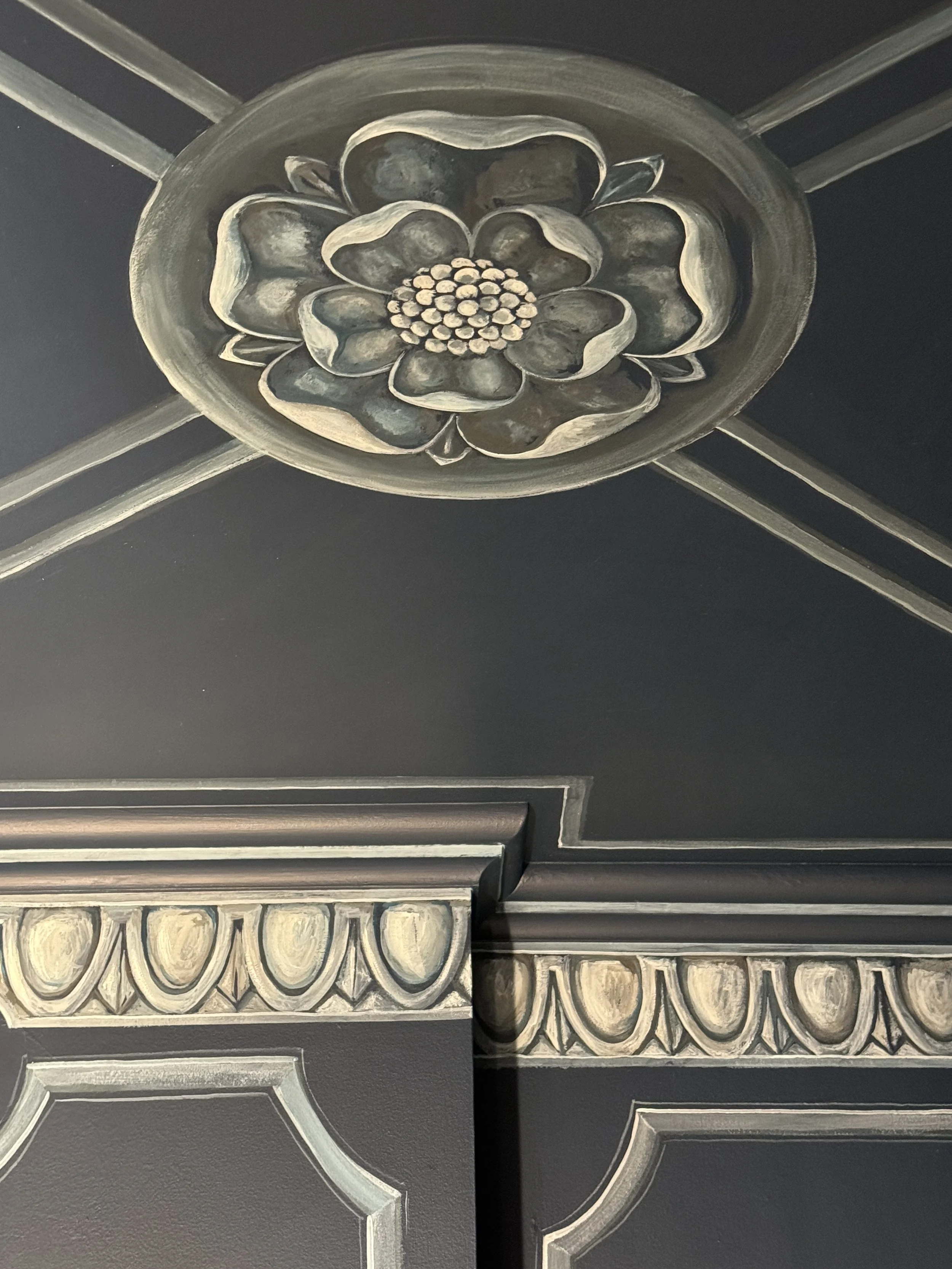 Inspired by the concept of poppies at twighlight, the bathroom was completely silver leafed and then hand painted poppies were added on top in a monochromatic palette.